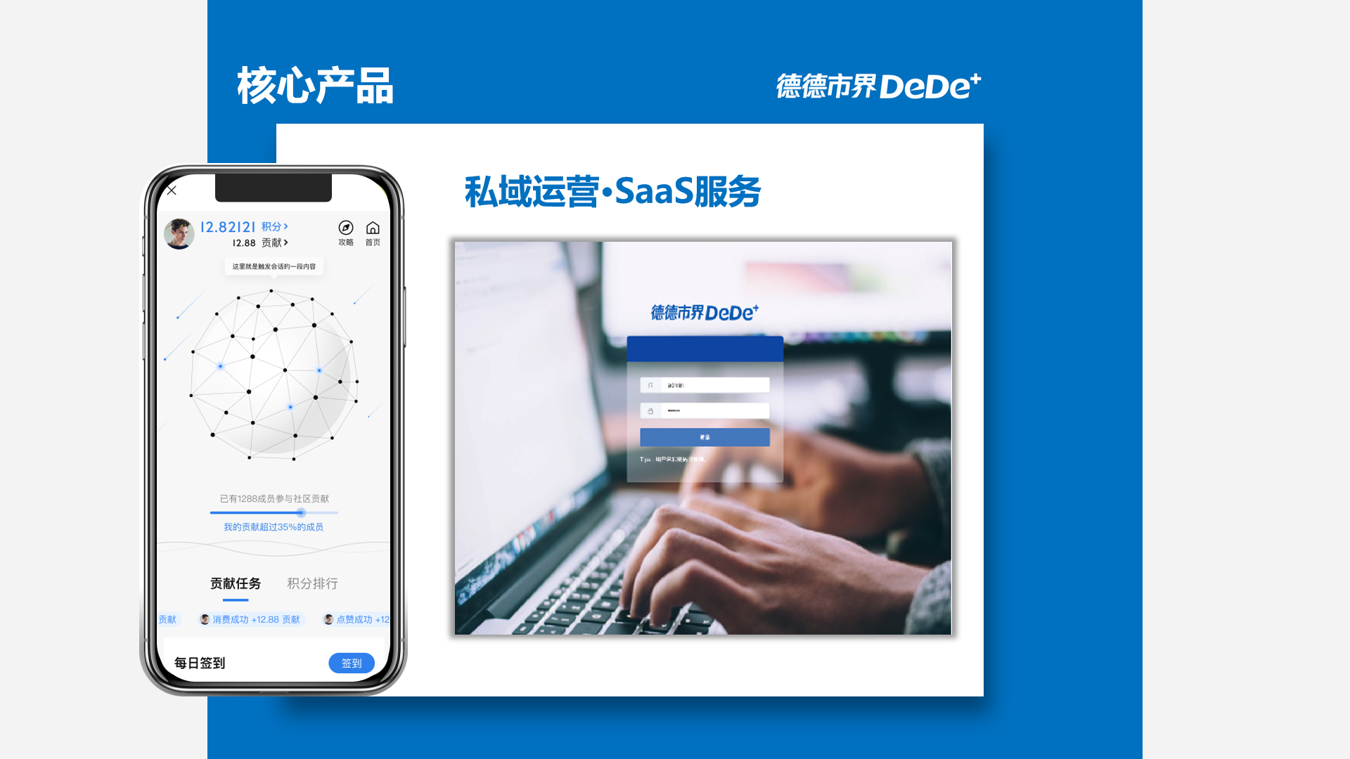 德德市界以AI激励算法技术专利原创为核心,应用区块链、云计算与SaaS技术,基于自组织DAO运营理念设计,为企业打造新一代私域流量运营SaaS解决方案——旨在解决私域流量运营过程中获客转化成本高、用户忠实度低、传统激励机制效果差、激励系统自建成本高等痛点。通过AI激励算法引擎代替人工,高效实现私域流量运营的精准化、精细化与自动化;通过FISCO BCOS联盟链打造激励共识,实现可信营销;通过SaaS解决方案,实现轻量级、插拔式应用接入。致力于为企业运营降本增效,帮助重视用户运营的企业成功!公司项目进展及荣誉认证:·2019年1月,获得百万级种子投资4月,申请首项发明专利“基于扁平架构的数据处理系统、方法及相关设备”5月,上线首款基于专利技术的应用案例“拾味行”·...